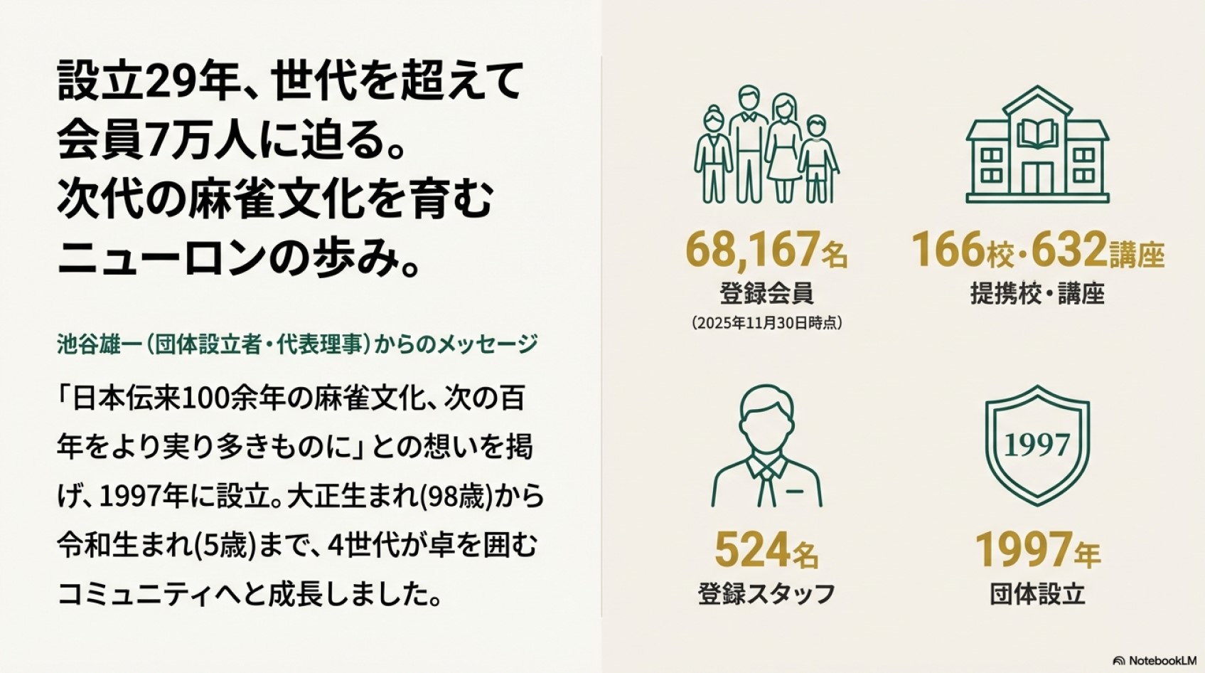 - 広範なネットワーク:提携校166校、提携講座632講座という膨大なネットワーク(カルチャーセンターや生活協同組合など)を通じて、麻雀を健全な趣味・文化として社会に定着させています。