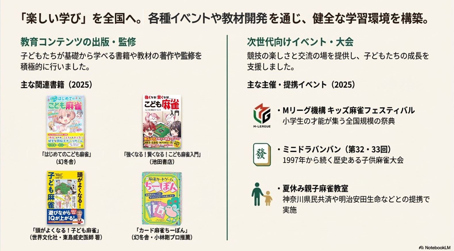 - 子供教育の推進:「子供麻雀教室」を通じて、未就学児から高校生までを対象に、「遊びながら学ぶ」機会を提供しています。子供向けの入門書やドリルの監修、大会の開催などを通じ、論理的思考やマナーを育む教育的側面がメディアからも高く評価されています。