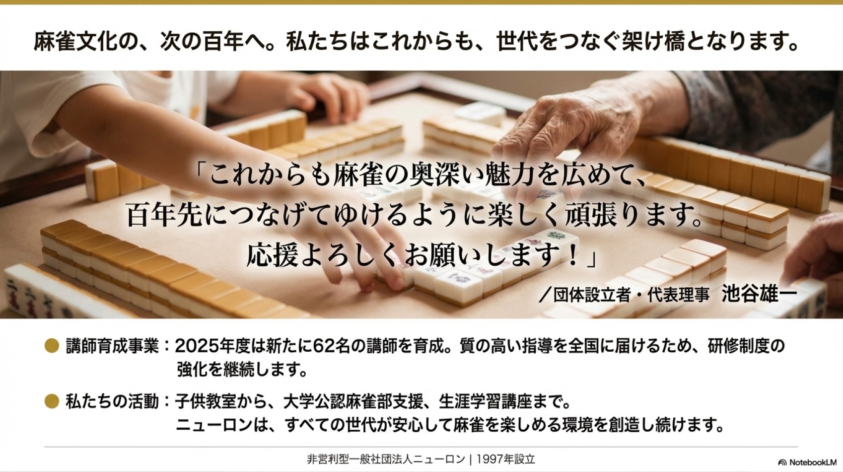 その活動の根底には「日本伝来100余年の麻雀文化を、次の100年へより実り多きものとしてつなげていく」という長期的なビジョンがあります。