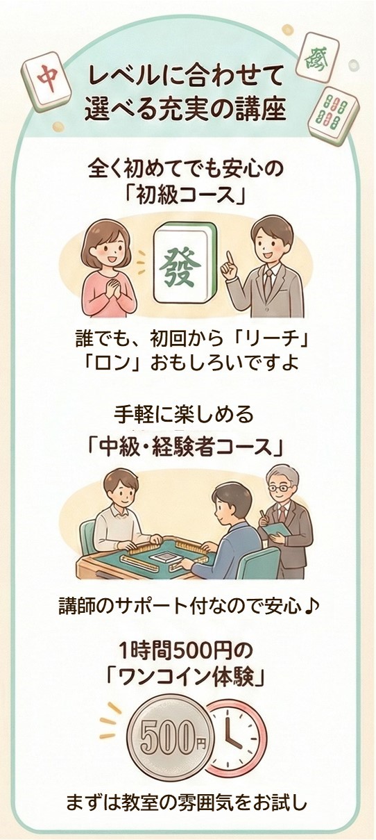 🔶健全な趣味としての麻雀を🔶認定講師の指導のもと🔶子供から大人まで🔶気軽に学んで楽しめる🔶会員制カルチャー教室です