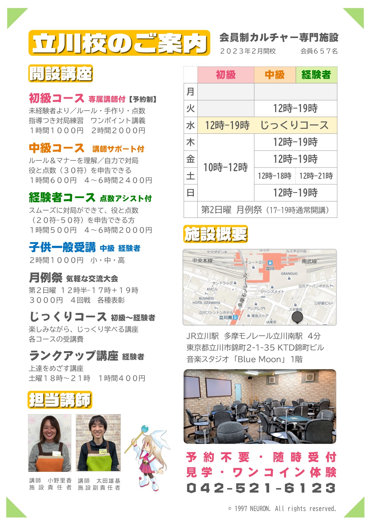 健全な趣味・頭脳スポーツとしての麻雀を/認定講師の指導のもと/老若男女どなたでも/一人で気軽に学んで楽しめる/会員制カルチャー教室です