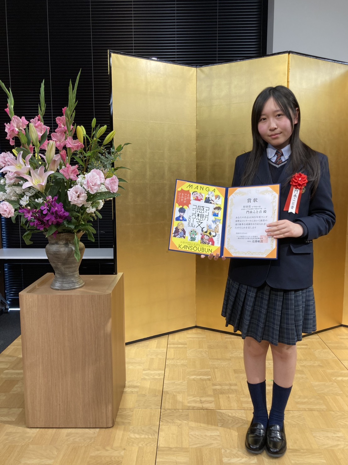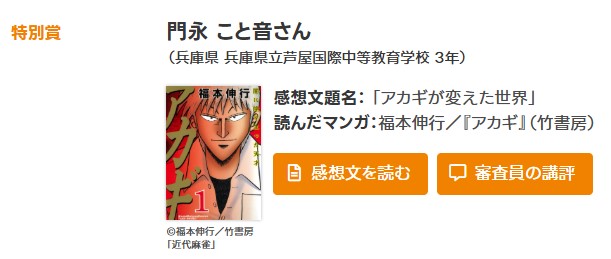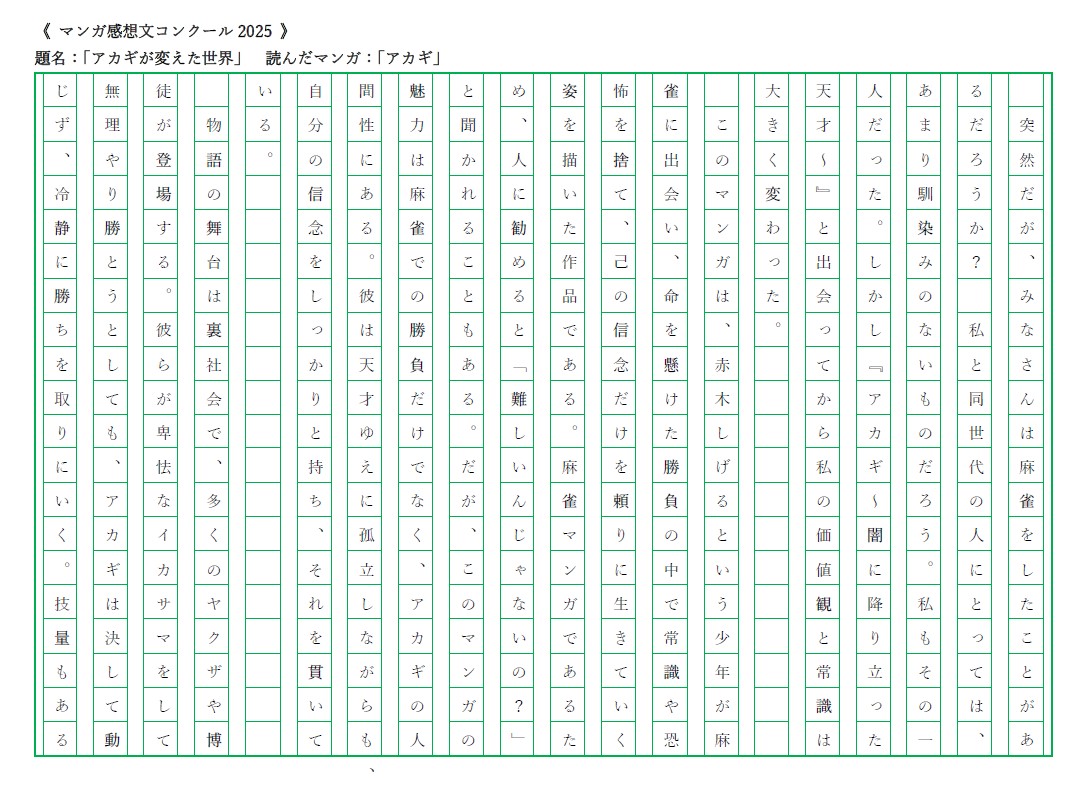 一般財団法人 出版文化産業振興財団が主催する「マンガ感想コンクール2025」にて、ニューロン子供麻雀教室 神戸に通う、門永こと音さんの感想文「アカギが変えた世界」が中学校の部で特別賞を受賞しました。
