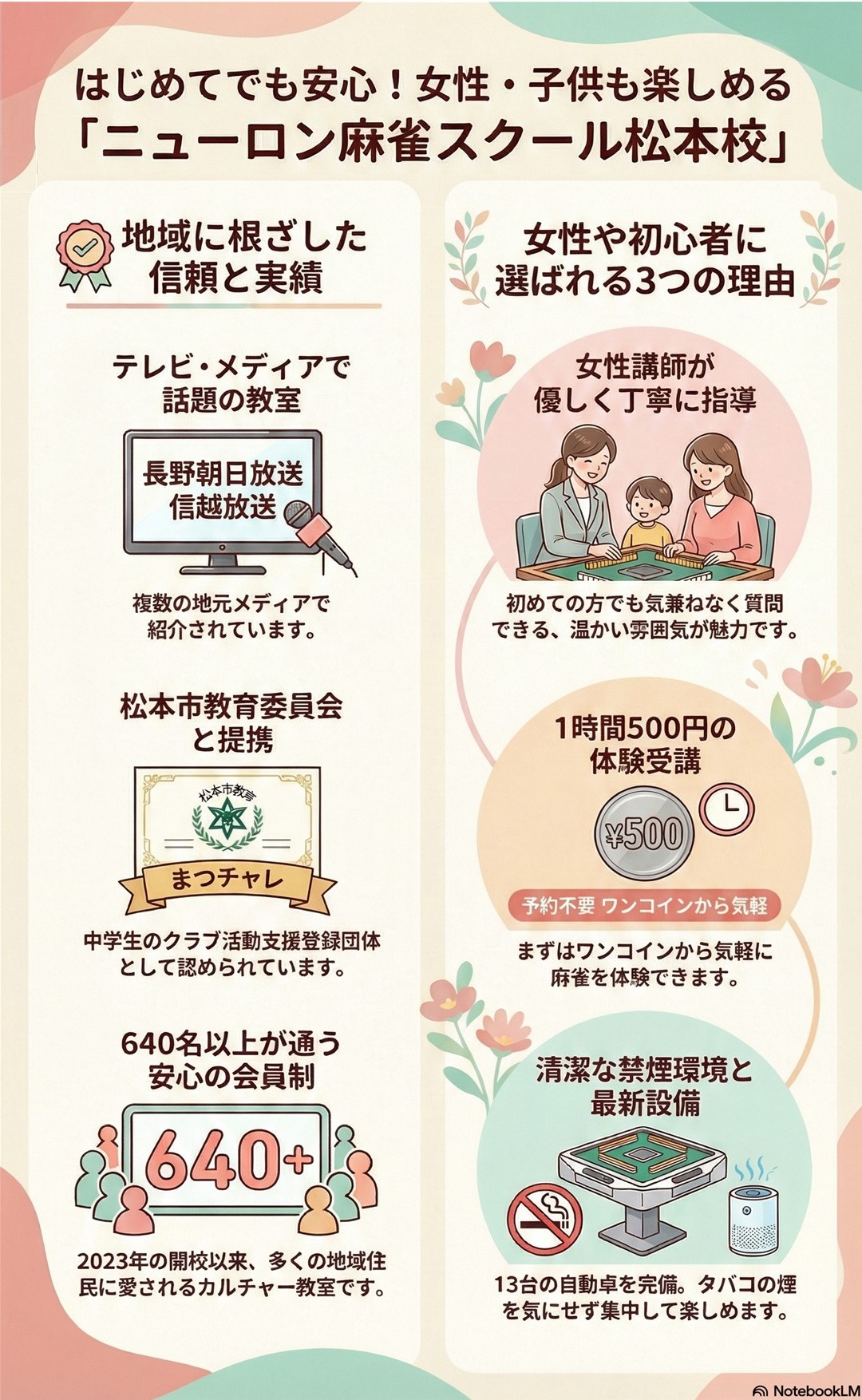 健全な趣味・頭脳スポーツとしての麻雀を/認定講師の指導のもと/老若男女どなたでも/気軽に学んで楽しめる/各種講座を開講