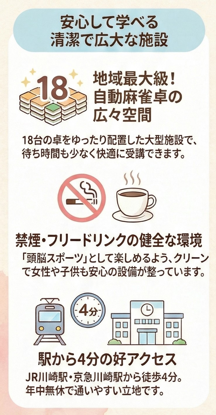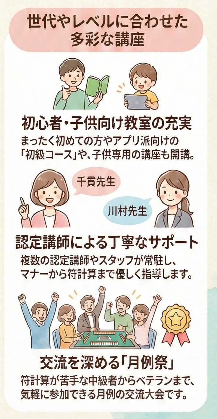 🔶健全な趣味としての麻雀を🔶認定講師の指導のもと🔶子供から大人まで🔶気軽に学んで楽しめる🔶会員制カルチャー教室です